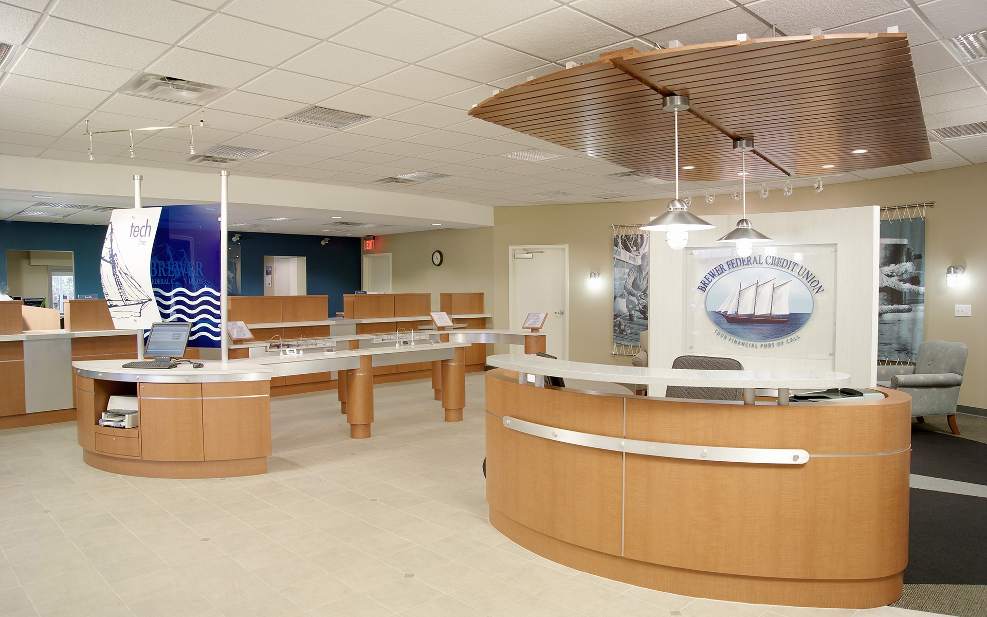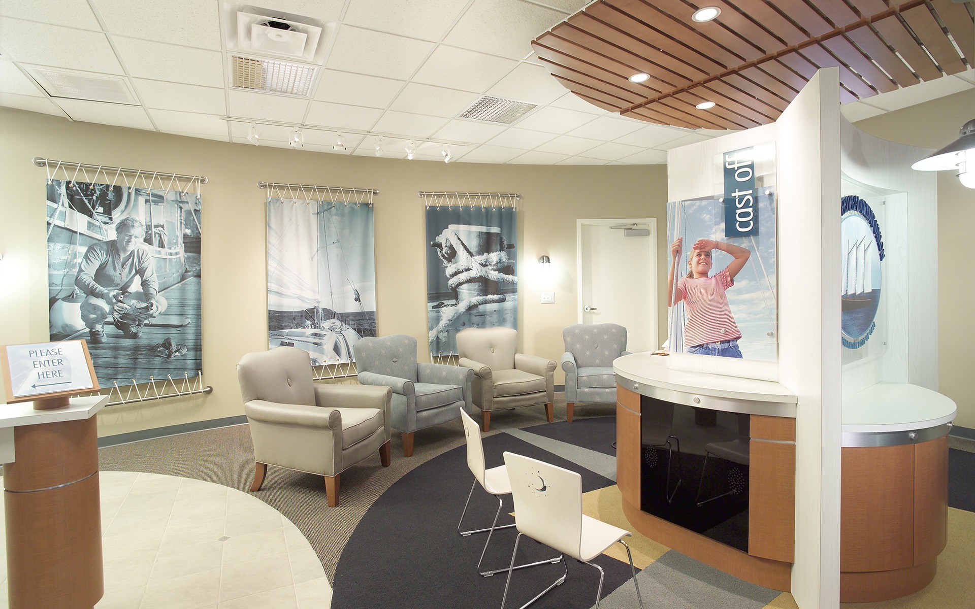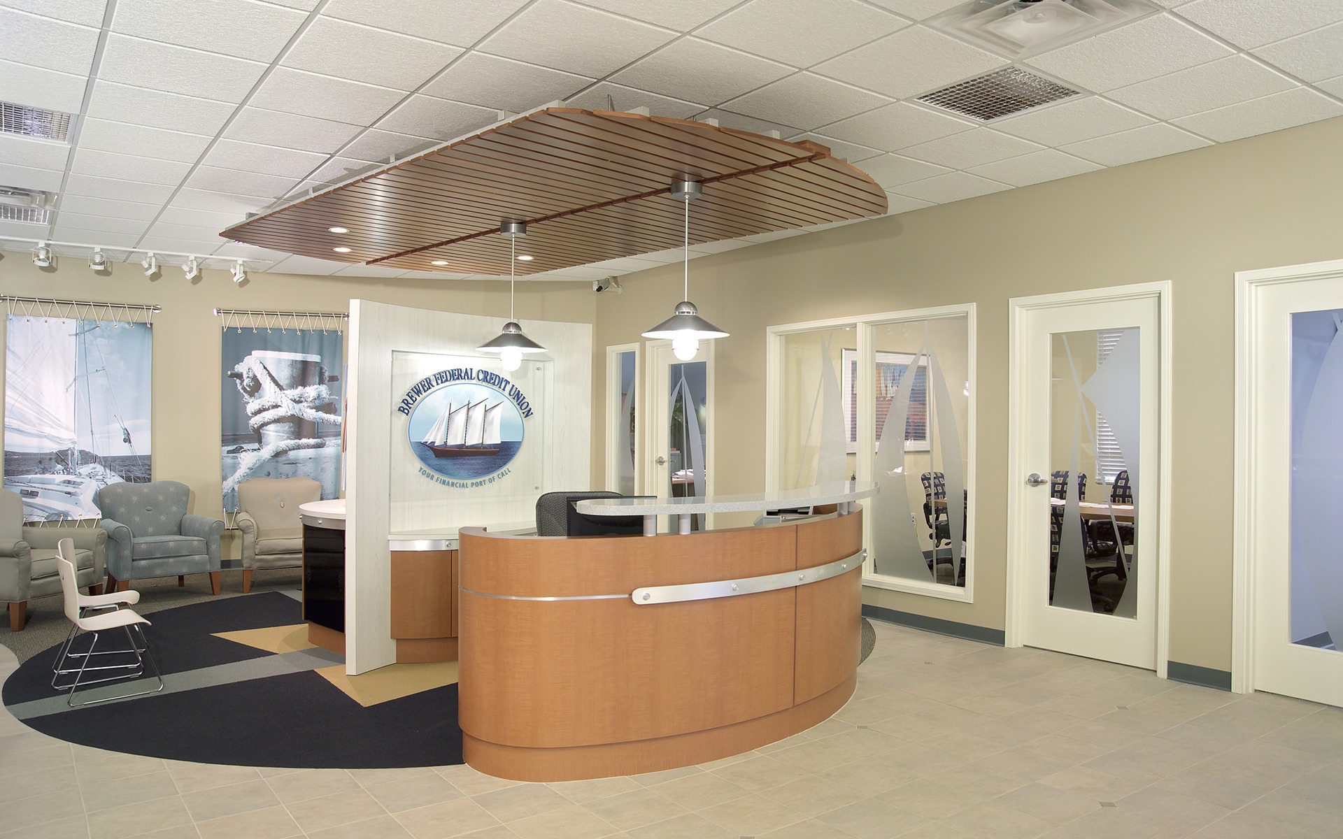 The design concept for Brewer’s new branch took inspiration from the nautical history deeply rooted in this region. The concept is carried through the interior with a tonal blue color palette and by incorporating elements reminiscent of sailing.