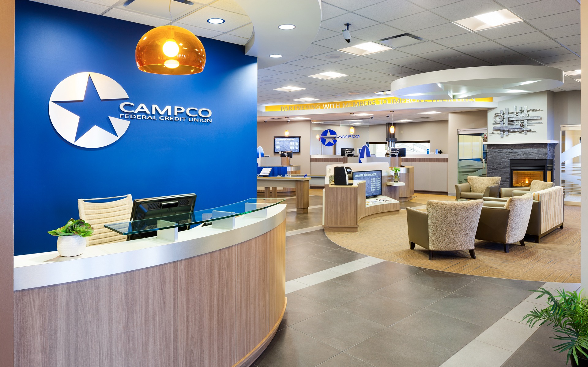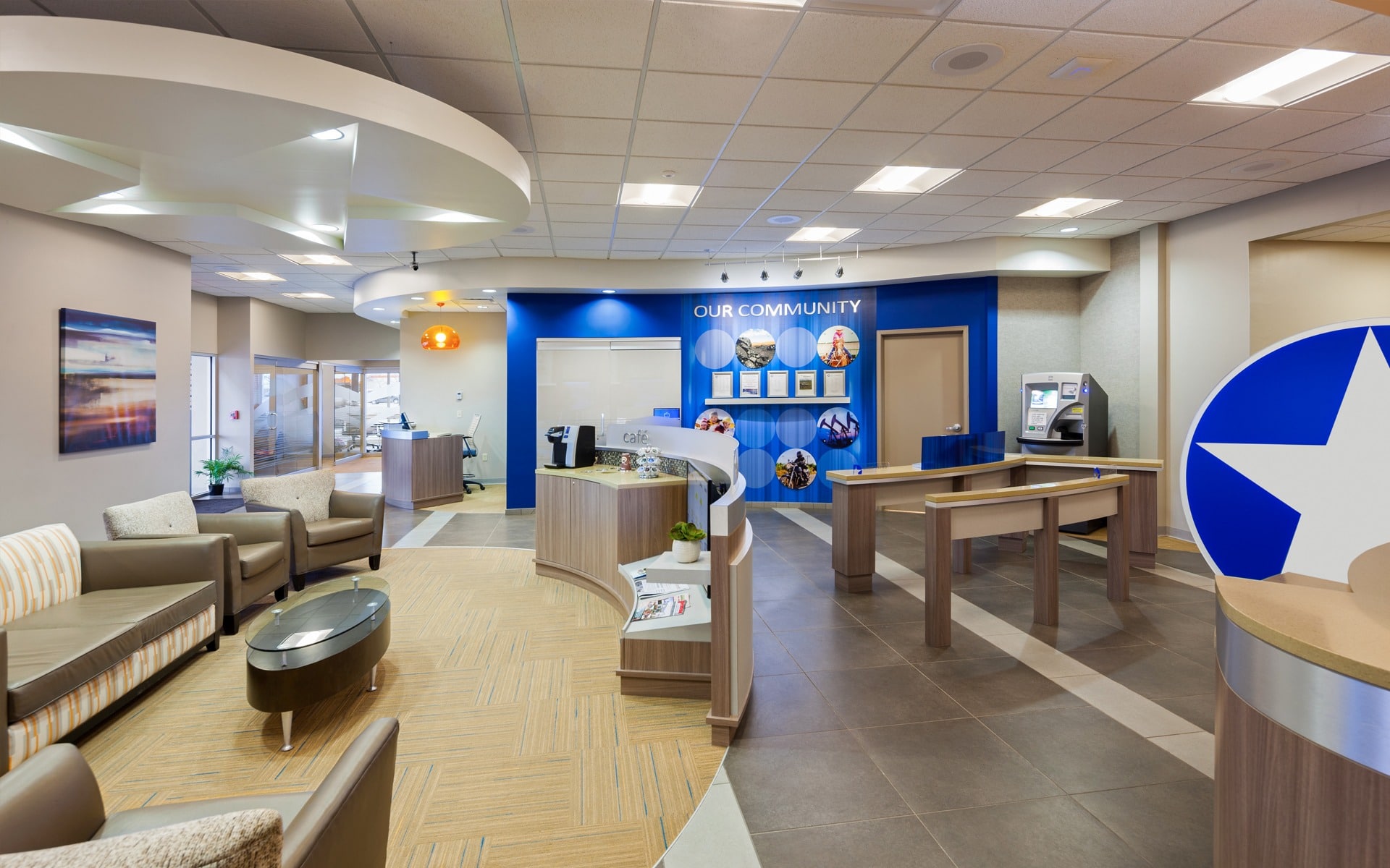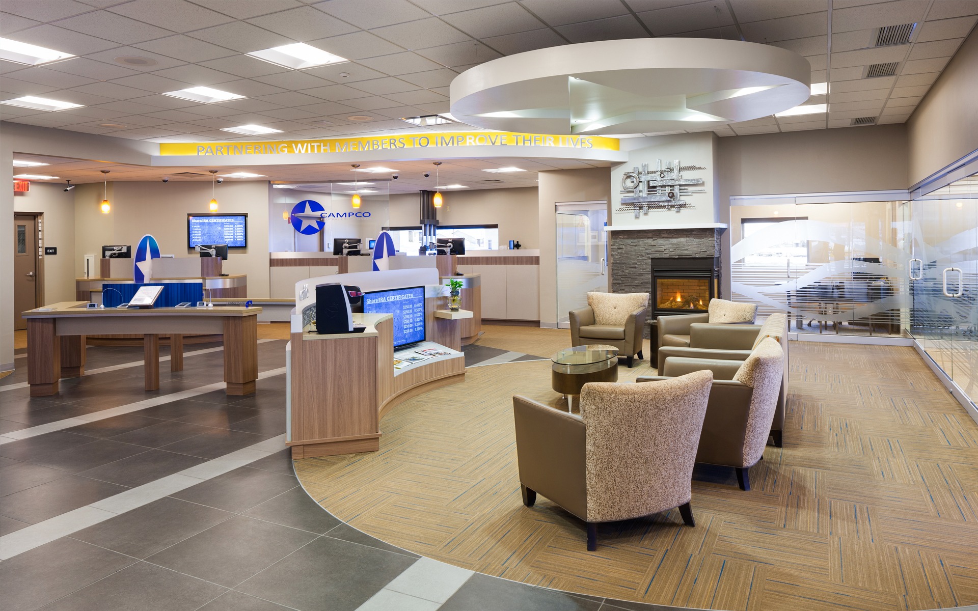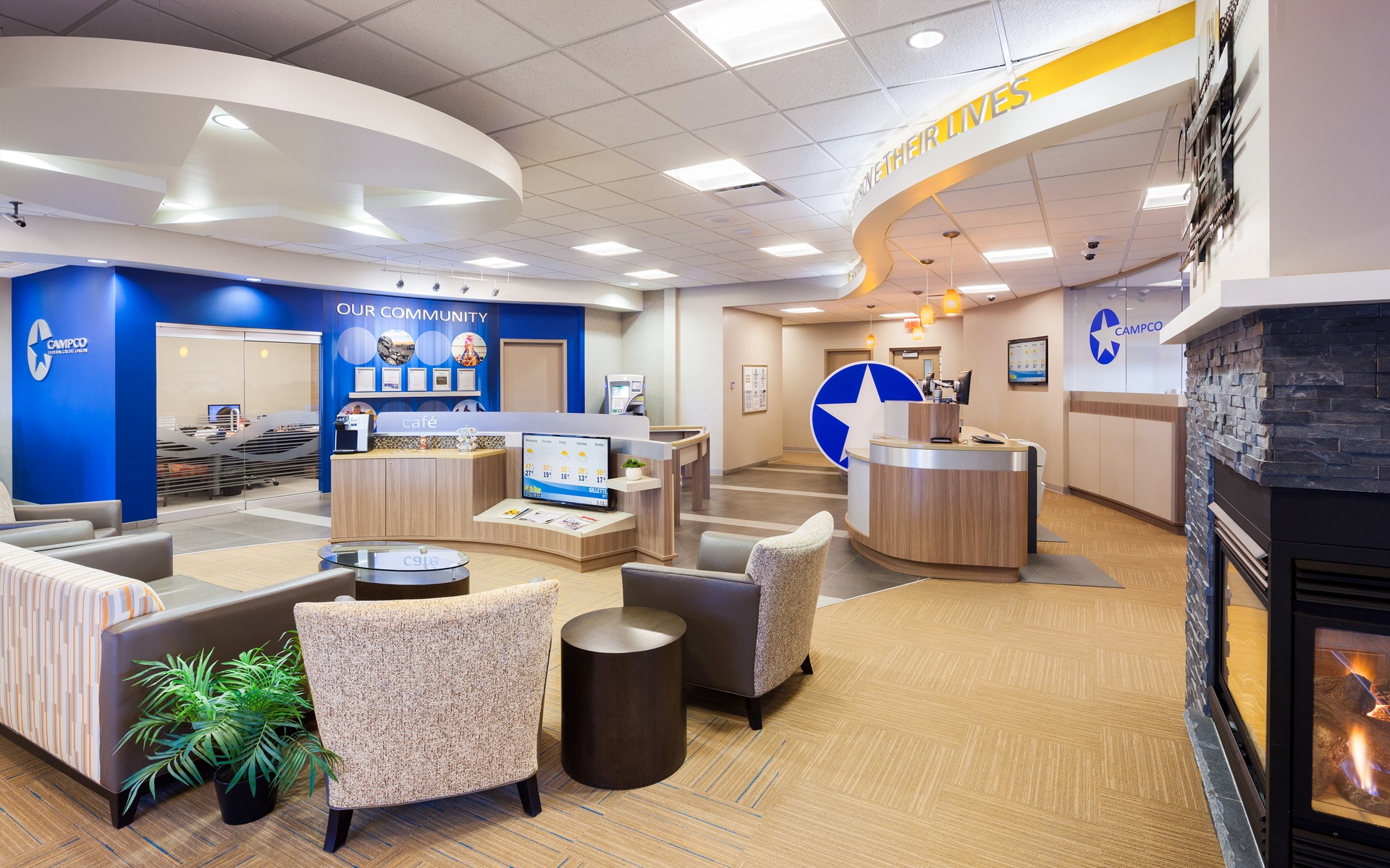 Campco wanted something “unpredictable” to rural Wyoming. The exterior features a clear-story vestibule with large scale murals, specialty lighting and spans of glass that allow the building to shine during the evening hours and provides a distinct “WOW” factor. The interior is modern and bright with a fireplace to add warmth. Teller pods were introduced to enhance cross-selling and relationship building.