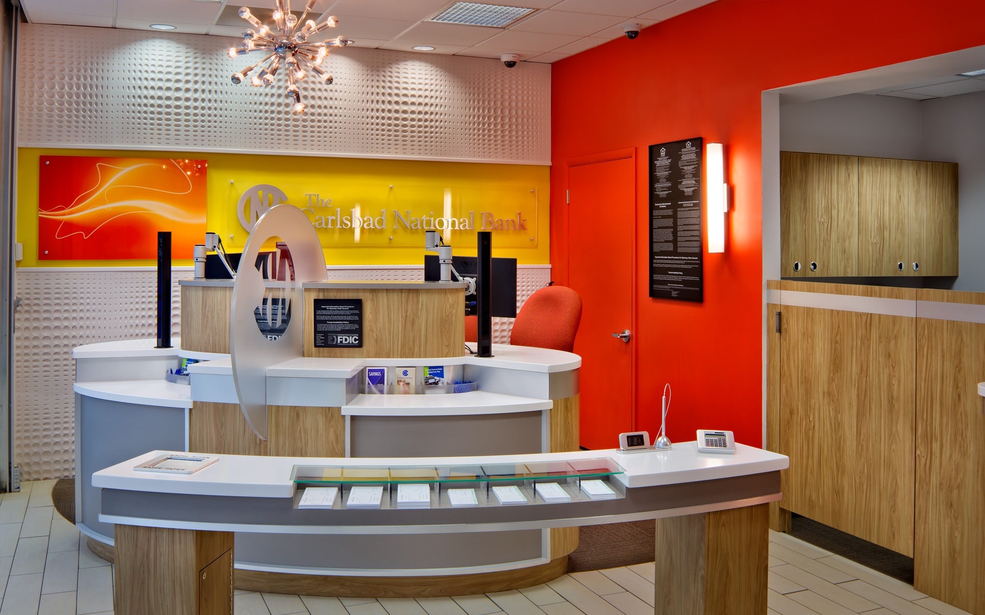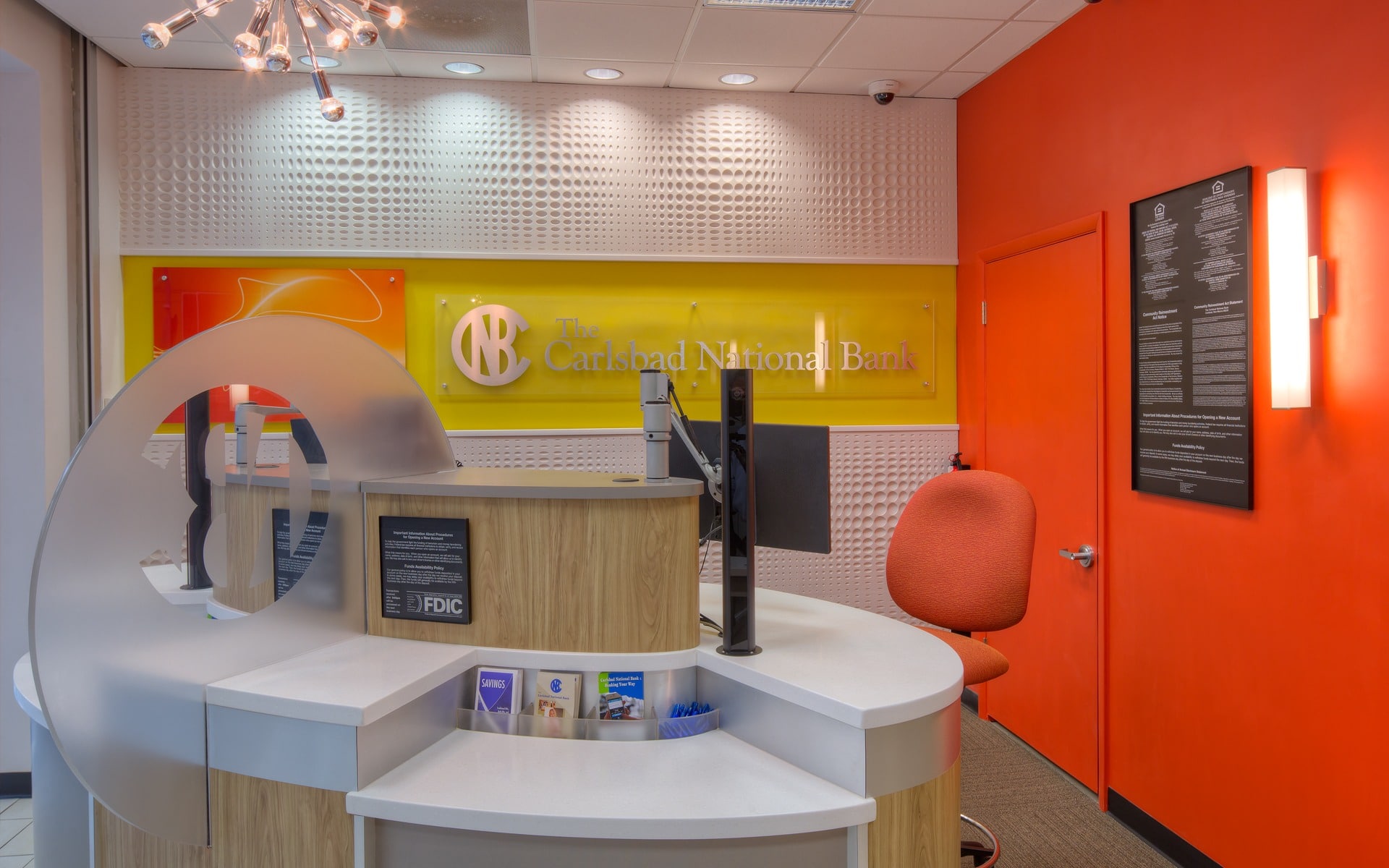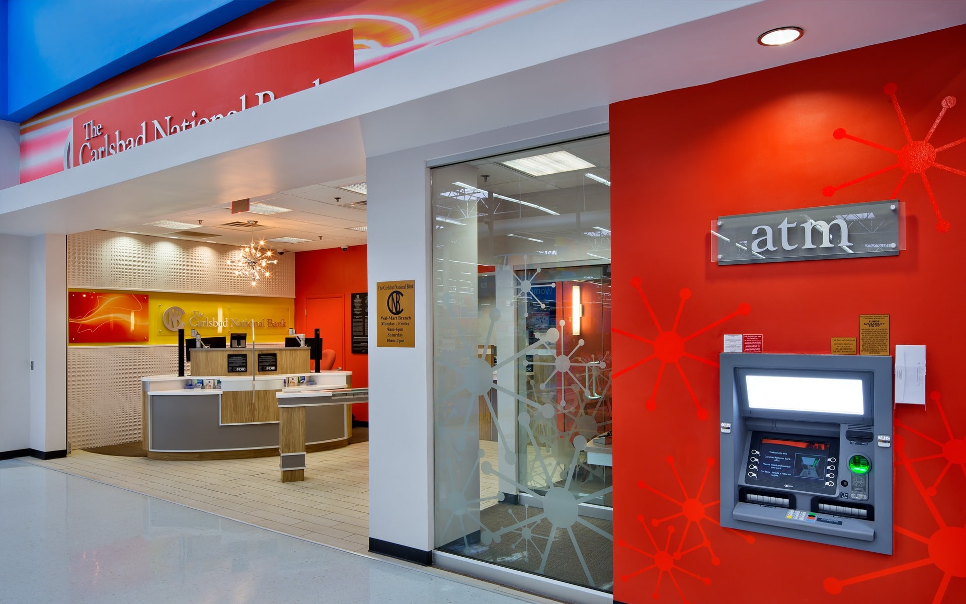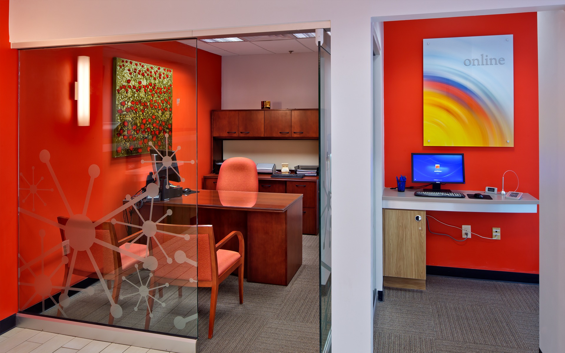 To stand out against the WalMart blue, the design includes orange and bright yellow. A textured panel on the back wall adds impact and dimension while promoting brand messaging. This eye-catching branch incorporates the modern twist the client wanted and sets them apart from the competition in a high-traffic, retail environment.