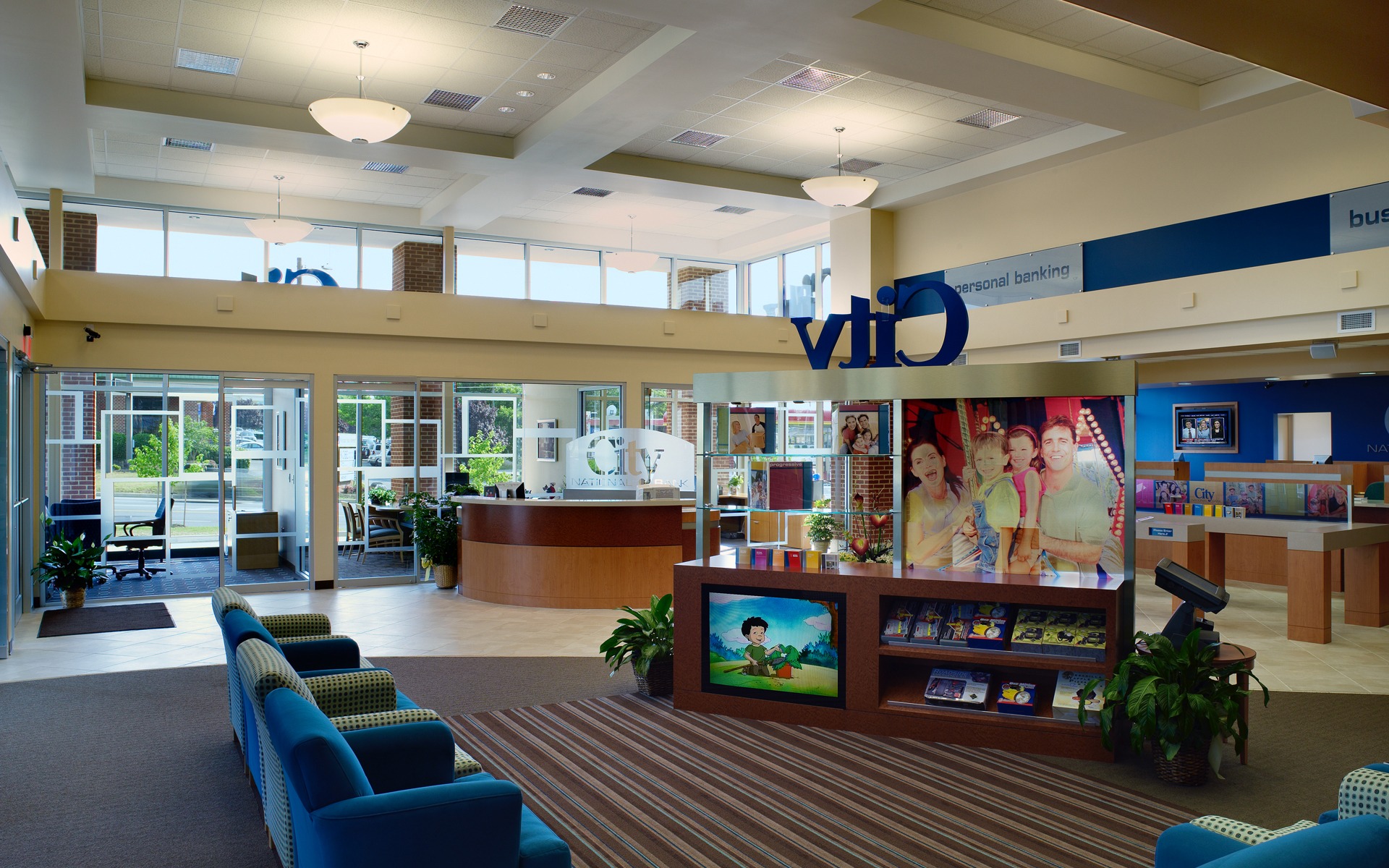 This regional branch follows the prototype design to create a consistent brand image. However, this facility is larger to accommodate more drive-thru lanes, additional loan officers and services to serve the larger target market in this area.