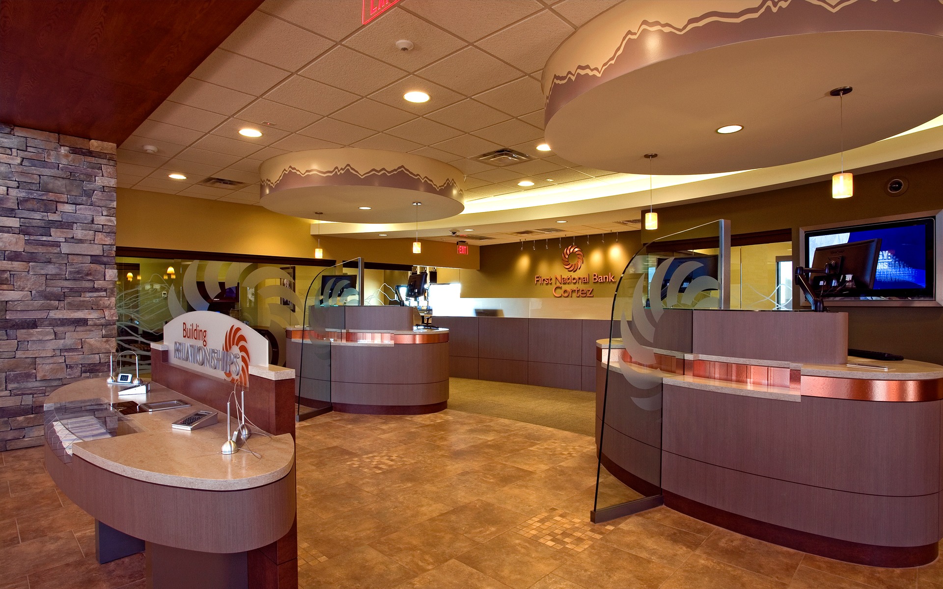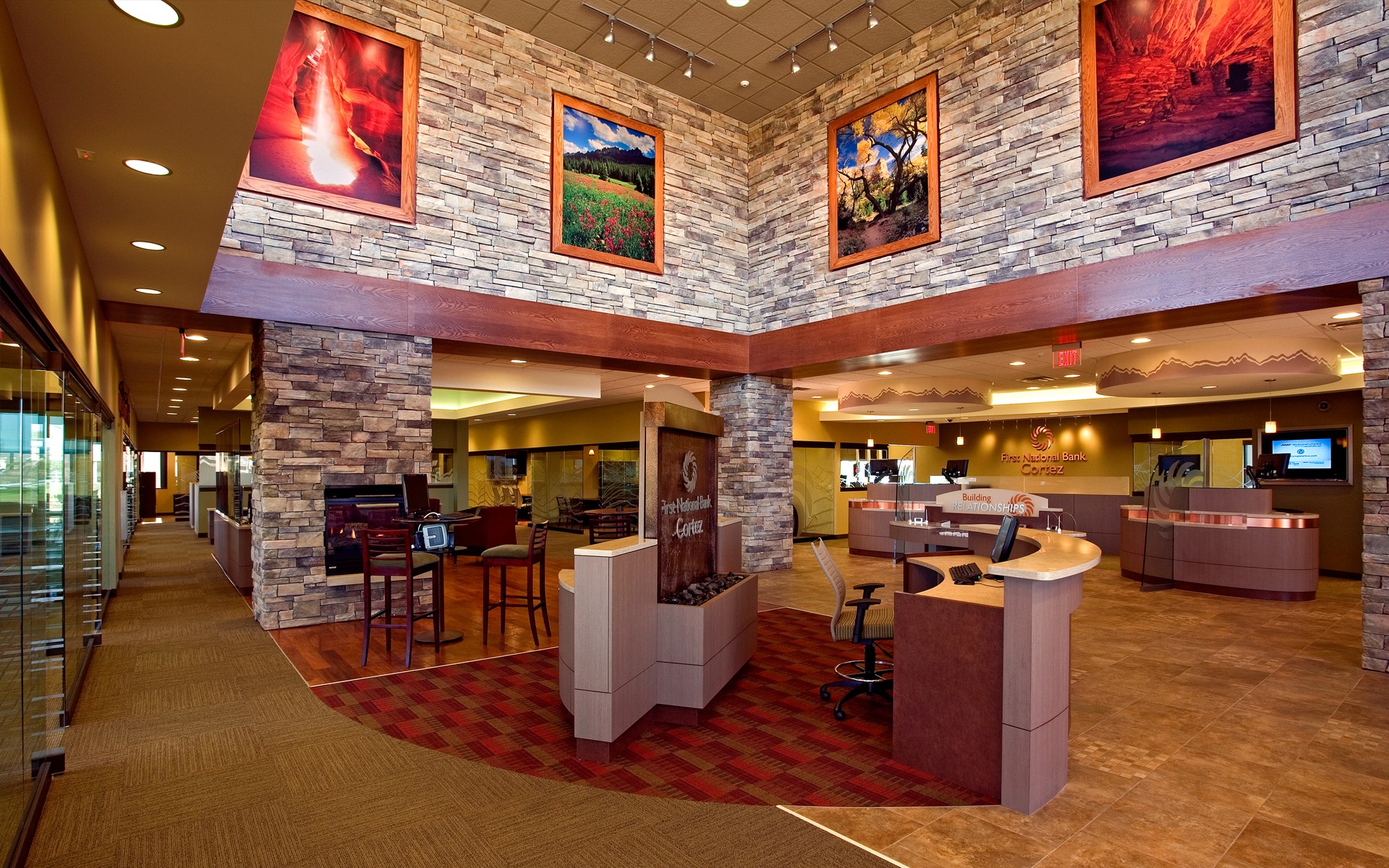 The bank wanted a project that created a statement to the community while being environmentally conscious. A lighting management system throughout the building adjusts interior lighting based on the amount of natural sunlight filtering in through the windows. Recycled materials are used throughout the interior and an exterior insulation system minimizes energy leakage.