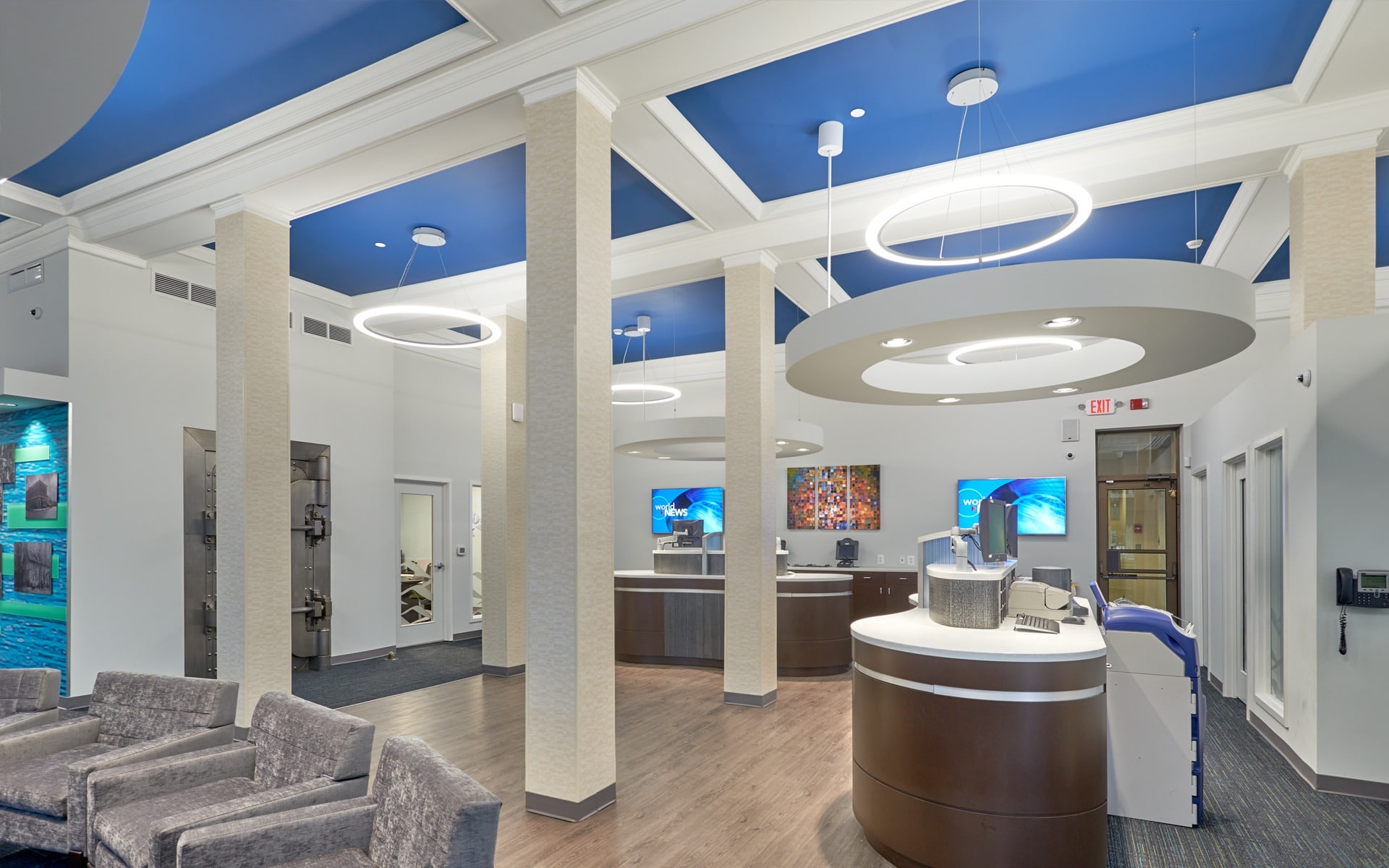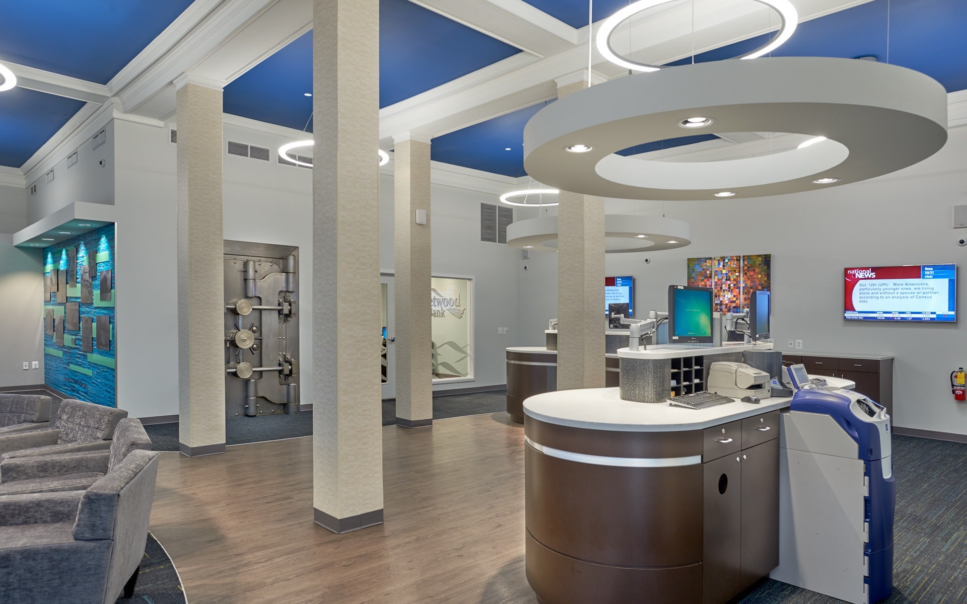 DEI renovated the banks 3-story, historic building to modernize the existing space and highlight the building’s original architectural elements. The design is a boutique feel with a neutral backdrop and pops of color that emphasize the height of the ceiling. The finished look is a blending of modern elements with the classic architecture.
