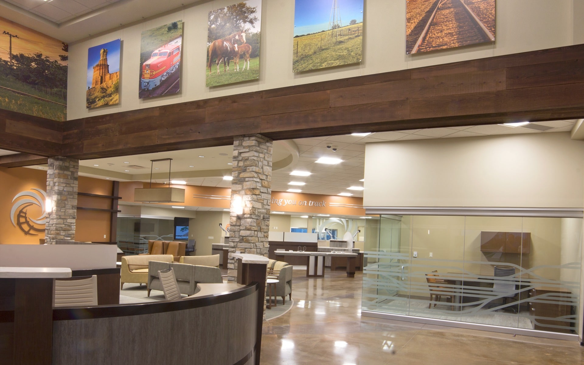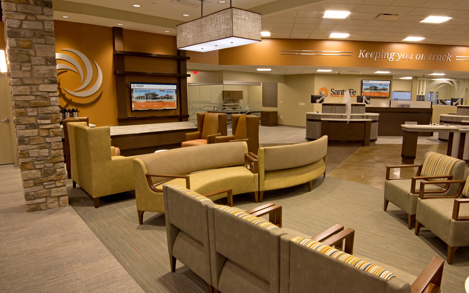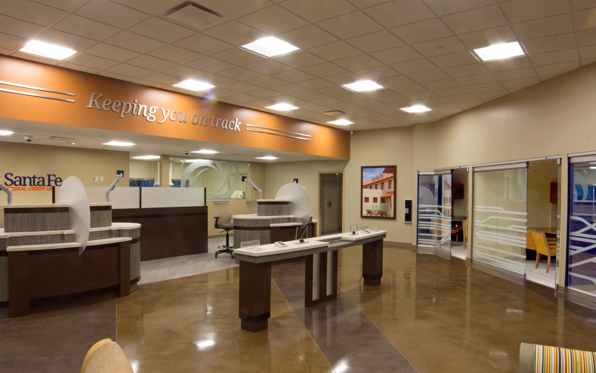 Santa Fe FCU hired DEI to re-brand, design and build a new main office. DEI’s designers developed a new logo, color scheme and imagery which is used throughout the interior to reinforce the brand of “Keeping You on Track.” Spans of glass allow natural light into the building and the interior features stone, wooden beams and natural materials for a rustic look. Santa Fe also incorporated dialogue pods.
