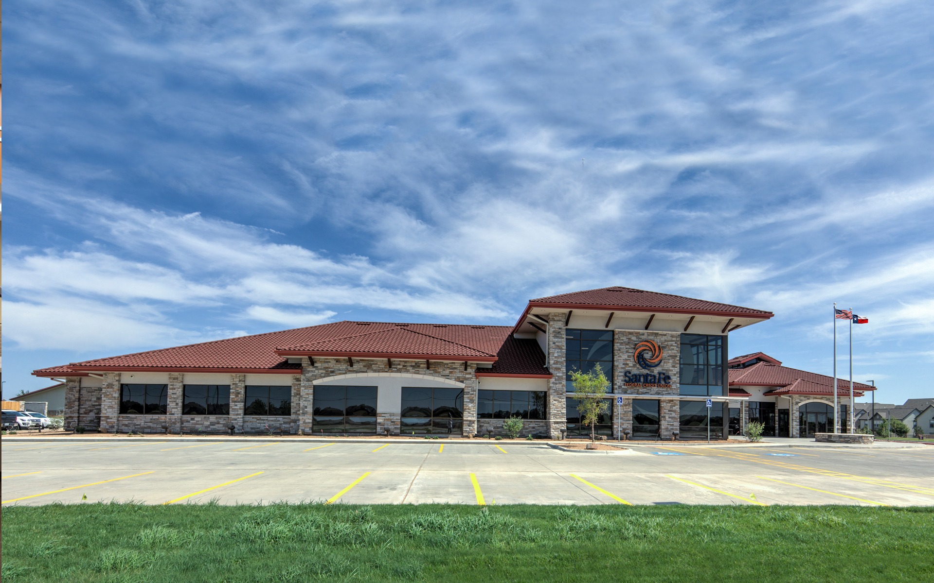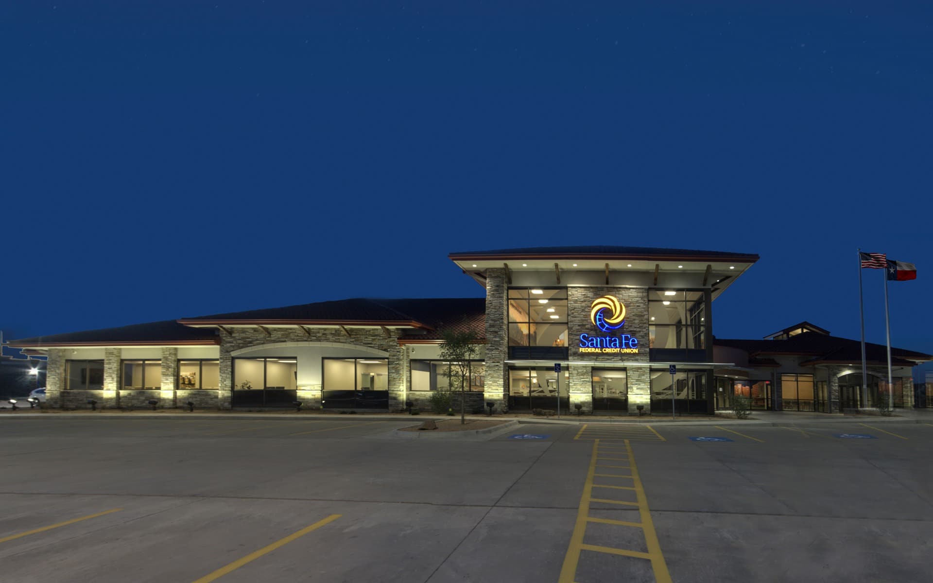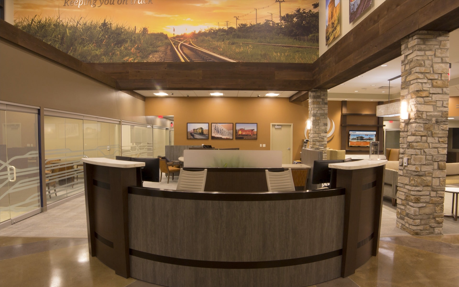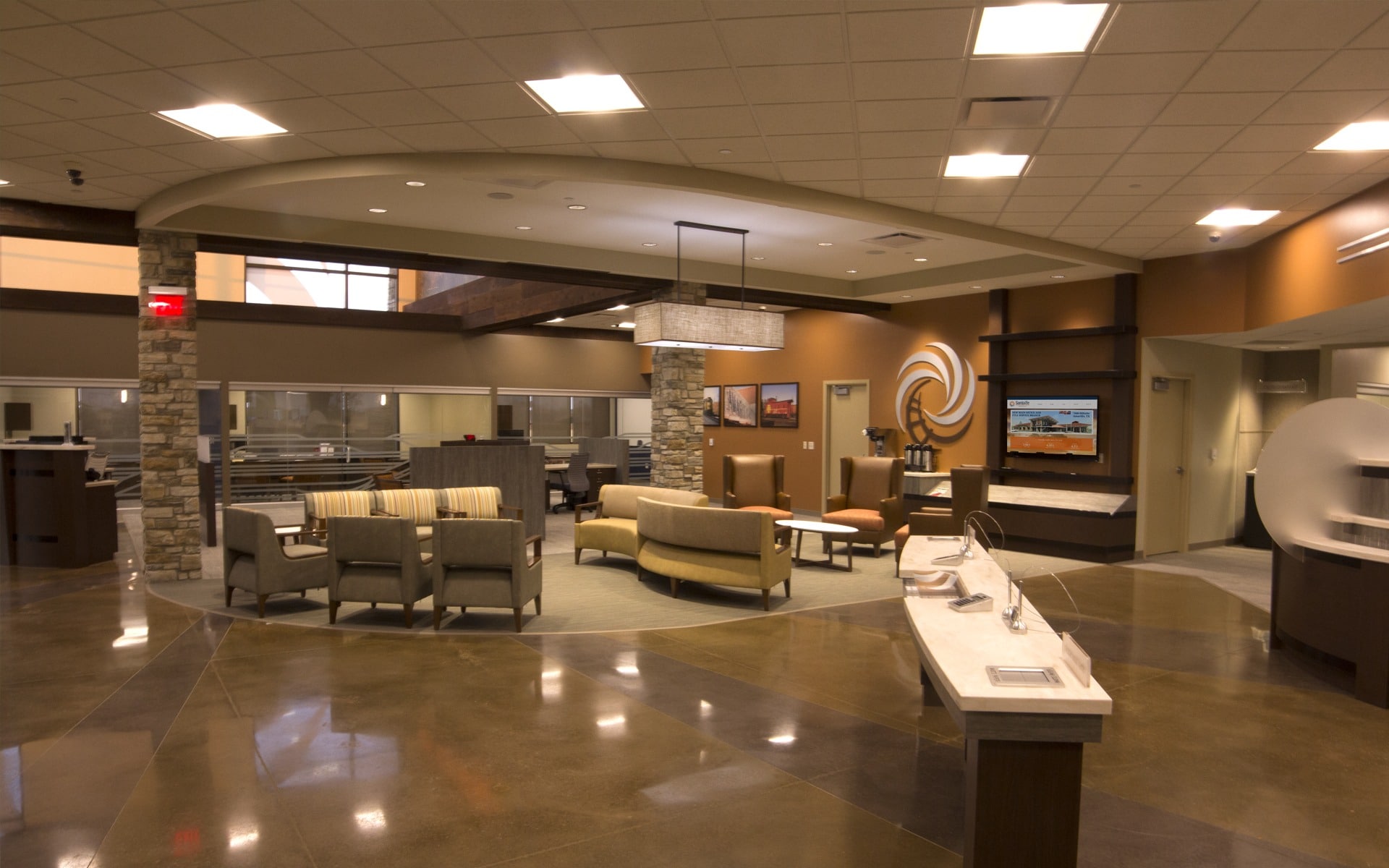 Santa Fe FCU hired DEI to re-brand, design and build a new main office. DEI’s designers developed a new logo, color scheme and imagery which is used throughout the interior to reinforce the brand of “Keeping You on Track.” Spans of glass allow natural light into the building and the interior features stone, wooden beams and natural materials for a rustic look. Santa Fe also incorporated dialogue pods.